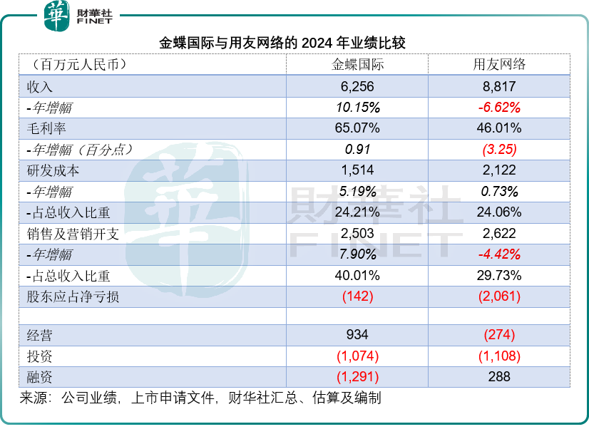 2024年,金蝶国际的云服务收入为51.07亿元,同比增长13.36%,毛利率按年提升0.85个百分点,至65.83%;而同期用友网络的云服务收入则按年下降3.46%,至68.04亿元,云服务毛利率按年下降2.08个百分点,至45.03%。