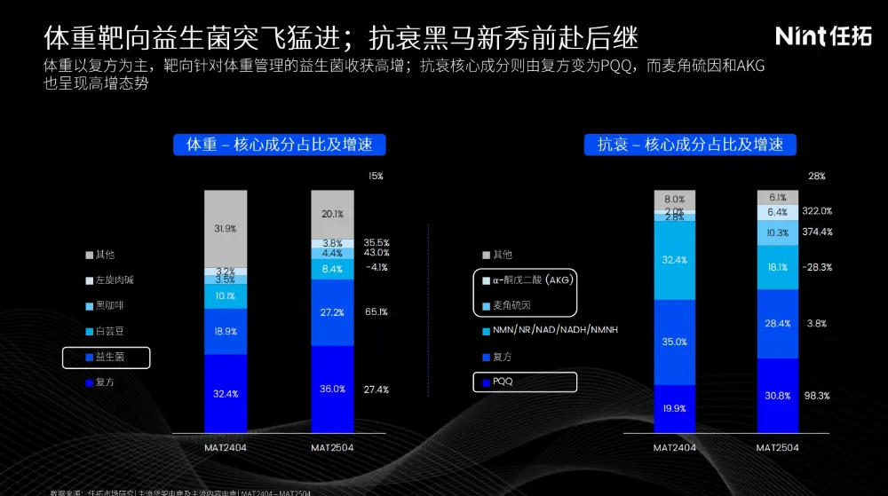 在体重方面,益生菌表现突出,从去年的18.9%增长至27.2%。在抗衰方面,功能成分的迭代更加激烈。NMN等成分的份额从去年近30%跌至18%,PQQ、麦角硫因、α-酮戊二酸(AKG)成为新晋黑马,增速分别为98%、374%和322%。