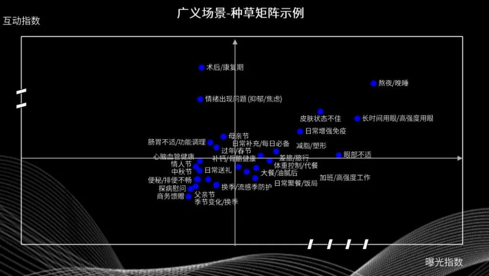 任拓的分析数据,主要来自于内容平台。横轴代表曝光指数,纵轴代表互动表现。具体的场景都可以在这个矩阵中进行描绘,从而去研究这些场景的内容表现。