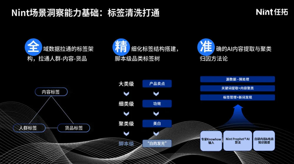 任拓在内容域、电商侧都有很强的数据能力,也有精细化标签的能力。标签作为打通内容到电商的中间介质,已成为内容策略校准的重要手段。它不仅是一个关键字,而是精准的洞察性的内容。识别场景机会点,再去挖掘场景下具体的消费需求,任拓通过内容标签的拆解去解码人群、卖点、痛点,为品牌破局提供了更明确的方向。