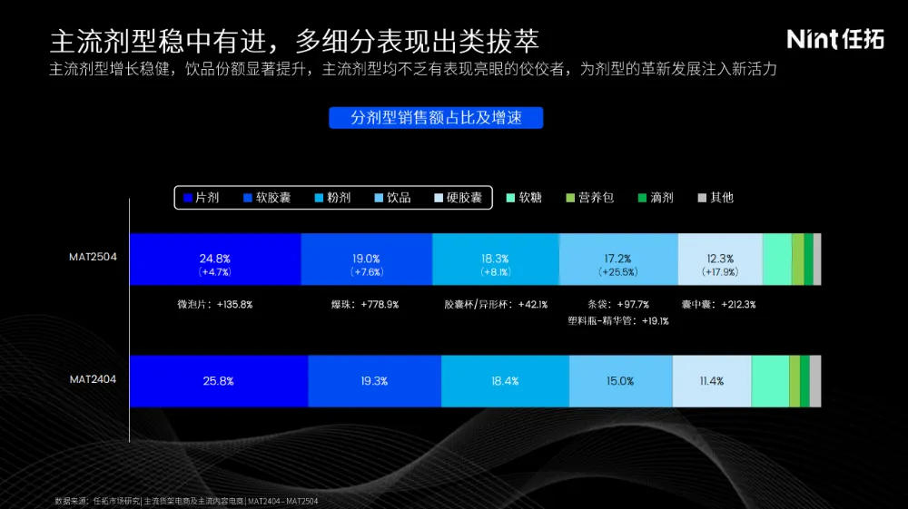 在剂型上,主流剂型市场占比90%,片剂、软胶囊、粉剂、饮品、硬胶囊等主流剂型稳健增长,饮品更是从去年的15%增长至17.2%。其中,片剂中的微泡片、粉剂中的胶囊杯、饮品中的条袋、精华管等形式,增长都很快。