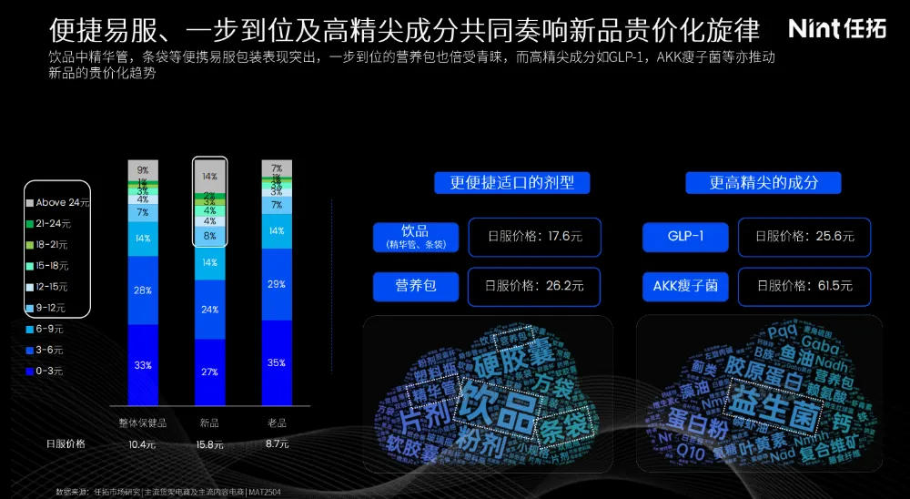 新品贵价化趋势的背后,有两个主要驱动因素。一个是新品更便捷易服用、一步到位的产品形态,比如精华管、条装袋装的产品形式等;另一方面,新品中出现更多高精尖的成分。