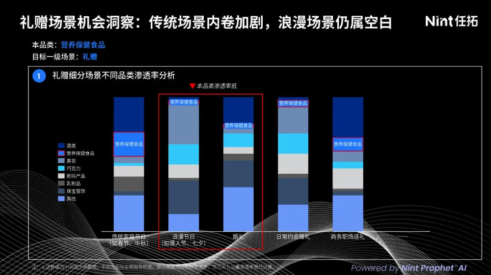 第二个机会场景是【浪漫节日】。浪漫节日相对婚礼场景来说,大家对健康功能性食品的接受度会更高,我们也看到很多品牌已经渗透到了该场景中。美妆、珠宝首饰等品类的渗透率已经超过一半了,他们针对这个场景也有很多做法值得借鉴。