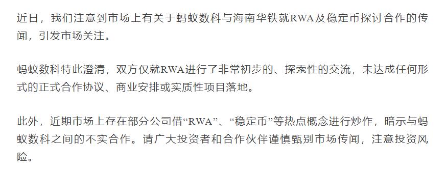 近期,市场上“蚂蚁数科与海南华铁就RWA和稳定币将开展合作”的传闻引发市场关注。