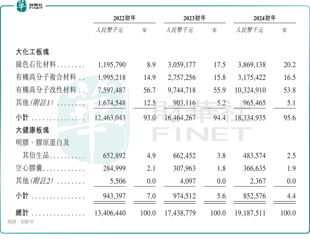 分业务来看,大化工板块是国恩股份的主要收入来源,2024财年该板块的收入达到183.35亿元,占财年营收的比重高达95.6%,其中有机高分子改性材料贡献的收入占财年营收的比重也达到了53.8%。