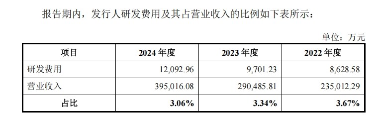 2022年至2024年,友升铝业的研发投入从0.86亿元增至1.21亿元,三年累计增长超过40%。同期,营收则从23.50亿元上涨至39.50亿元,增幅接近70%。两相对比之下,研发占营收的比例从3.67%一路滑落至3.06%,不仅未能保持同步,更呈现出随规模扩张被摊薄的趋势。