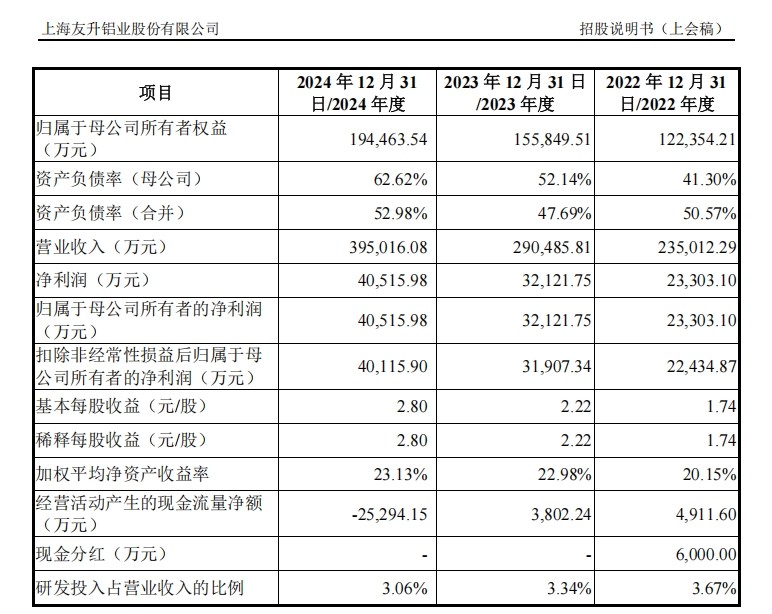 根据友升铝业招股书,2022年至2024年,其营业收入分别为23.50亿元、29.05亿元和39.50亿元;归属于母公司所有者的净利润分别为2.33亿元、3.21亿元与4.05亿元,呈现稳步上升态势。