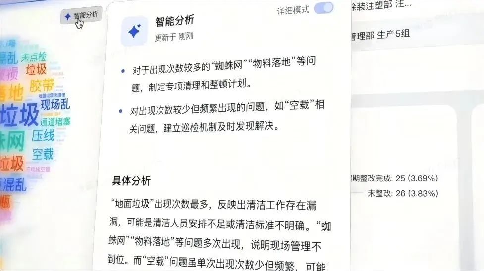 同时,在所有问题数据都沉淀在多维表格这张“数据库”之外,飞书的AI能力可以自动对这些数据进行抓取和分析,例如识别高频问题,自动统计出特定部门或班组最高发的TOP 3问题 ,让管理者清晰地看到主要矛盾,定位问题集中点:分析出问题最集中的车间和地点,让改善资源可以被精准投入等等。