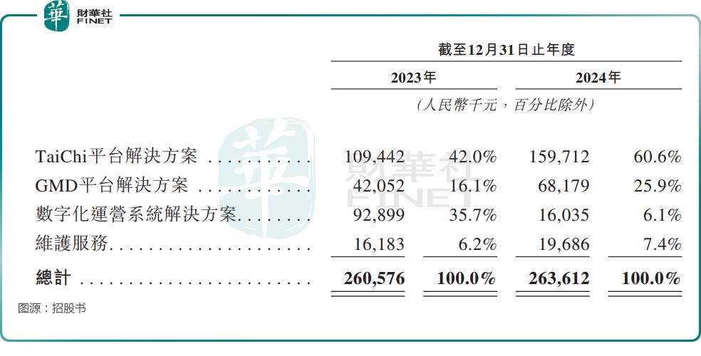 分产品来看,TaiChi平台解決方案是大医集团最主要的收入来源,GMD平台解決方案已经取代数字化运营系统解决方案,成为第二大收入来源,而数字化运营系统解决方案的收入在2024年暴降,收入占比大幅下滑。