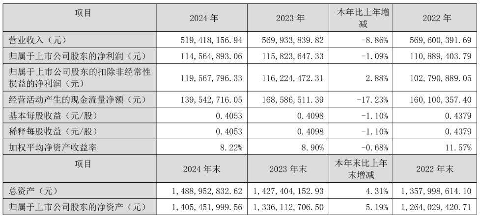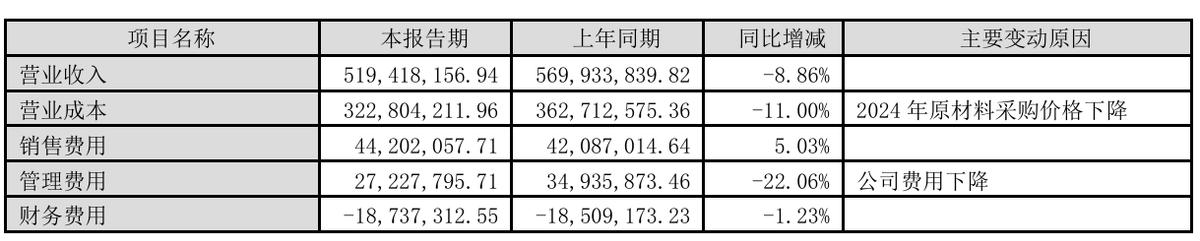 进入2024年后,受行业经济形势与外部需求变化的影响,阳光乳业的收入与净利润增长再度遇挫,年度总营收约为5.19亿元,同比下滑8.86%;归母净利润约为1.15亿元,同比下滑1.09%,经营压力可见一斑。