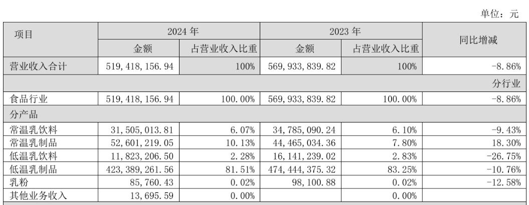 按照产品结构划分可知,阳光乳业对单一品类的依赖尤为显著,2024年来自低温乳制品的销售收入为4.23亿元,在总收入中的占比高达八成。也正因如此,该品类10.76%的收入下滑直接拖累了阳光乳业的整体业绩。