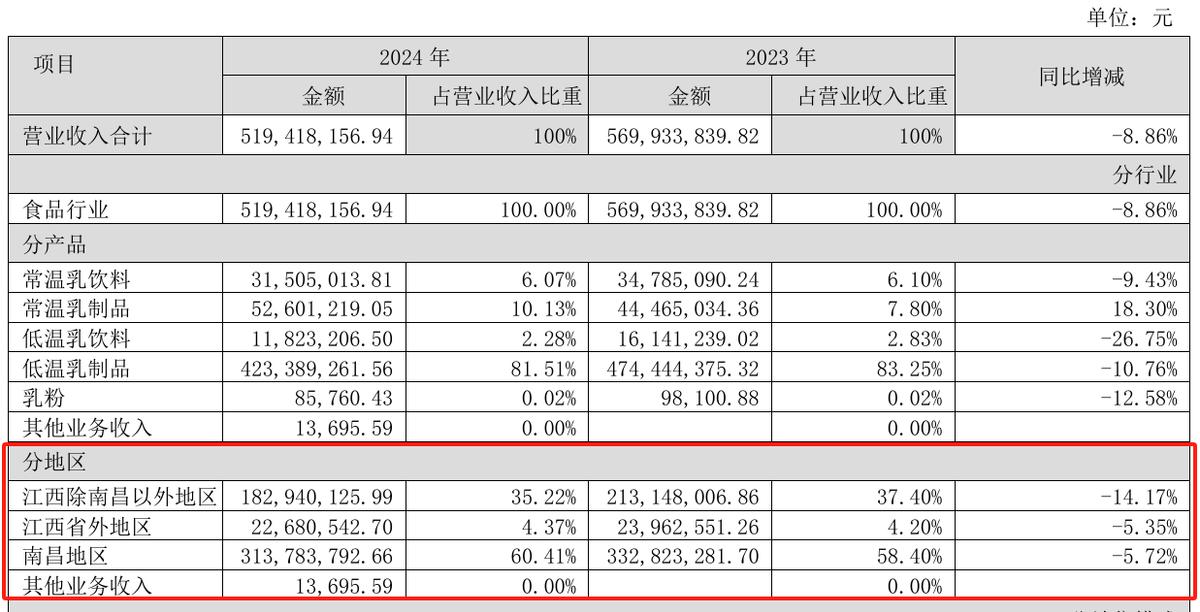 诚然,市场动荡是导致2024年阳光乳业出现核心经营指标负增长的主要原因,但自2022年登陆资本市场以来,该公司的业绩便长期处于承压状态,且企业经营的半径相当有限,区域性问题仍然不容忽视。